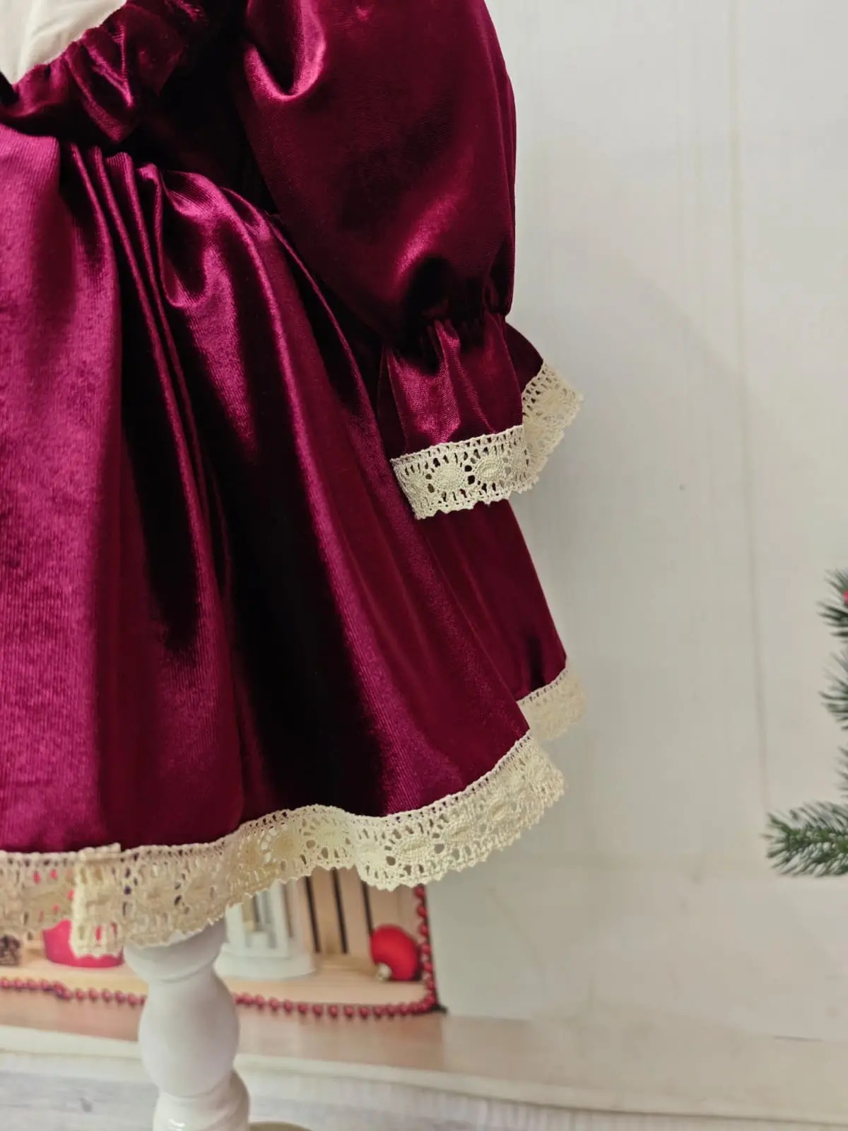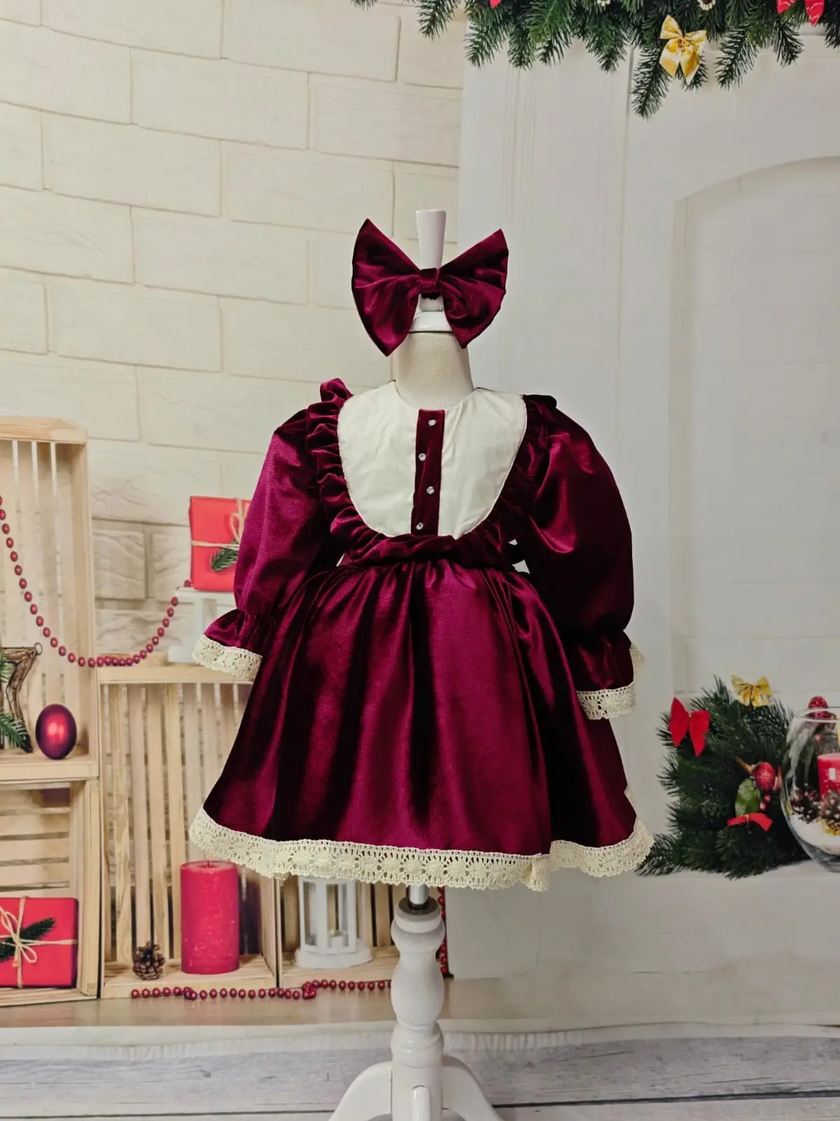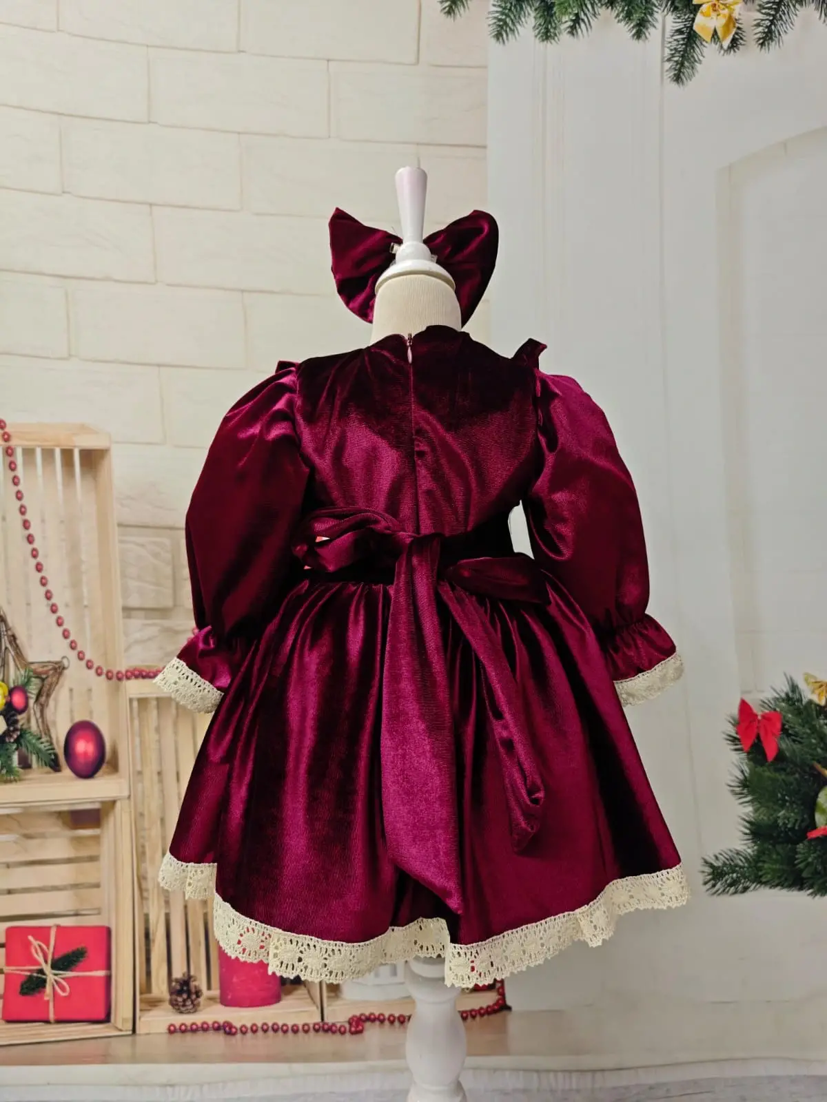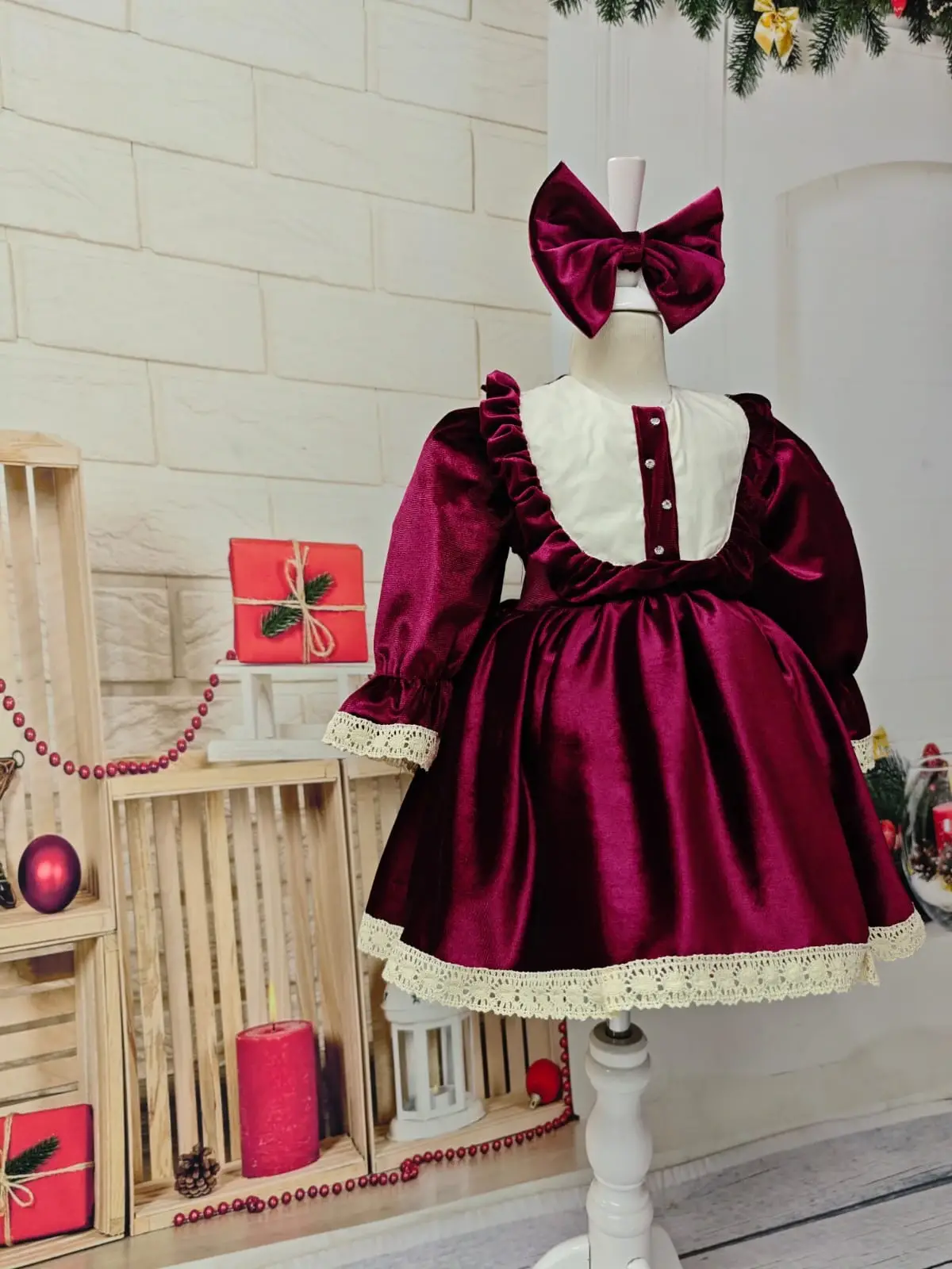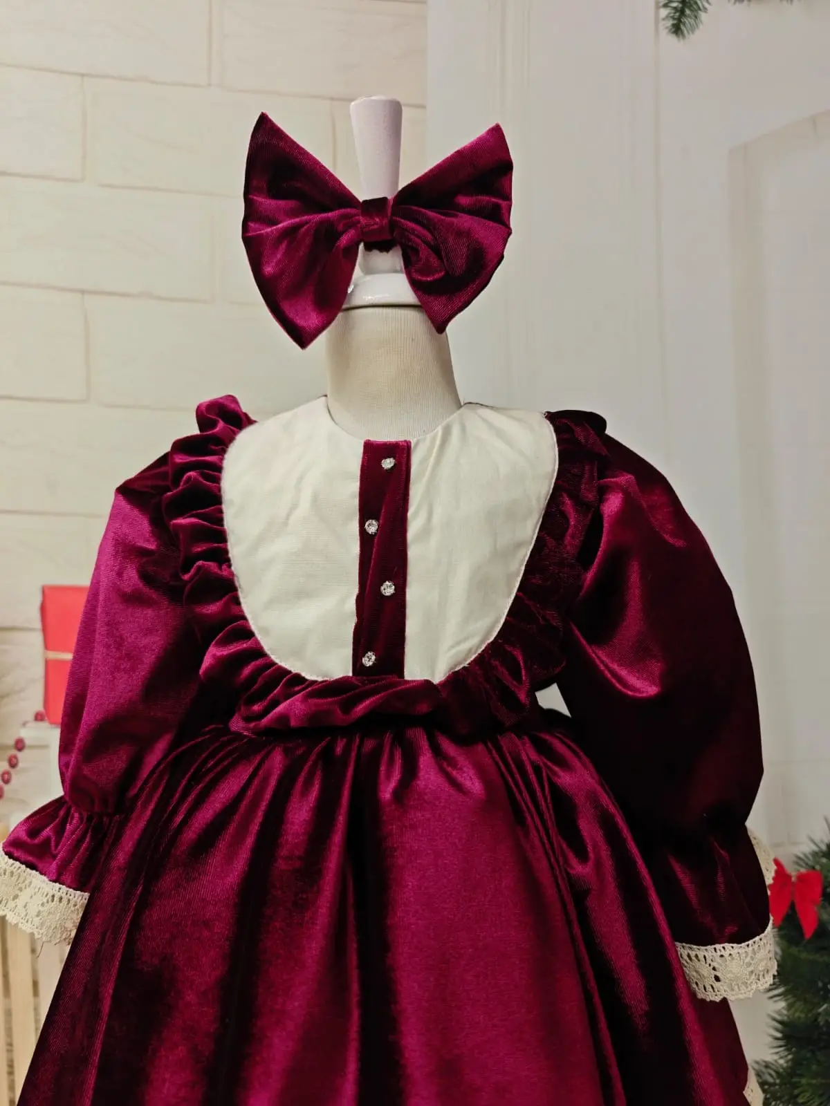 Küçük prensesler için özel olarak tasarlanmış bordo kadife abiye elbise, zarafeti ve şıklığı bir arada sunar. Yumuşacık kadife kumaşı ile hem sıcak tutar hem de lüks bir görünüm kazandırır. Göğüs ve bel kısmındaki inci detayları elbiseye zarafet katarken, büyük fiyonk aksesuarı dikkat çekici bir şıklık sağlar. Özel günlerde, doğum günü partilerinde veya yılbaşı kutlamalarında küçük hanımların göz kamaştırmasını sağlar.