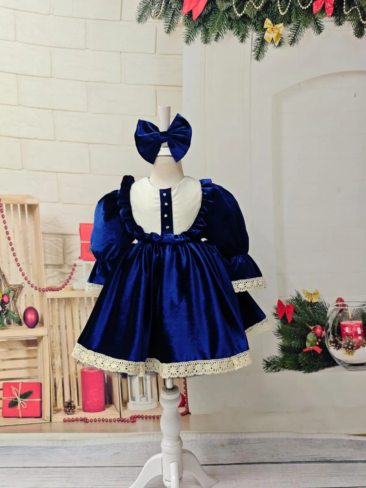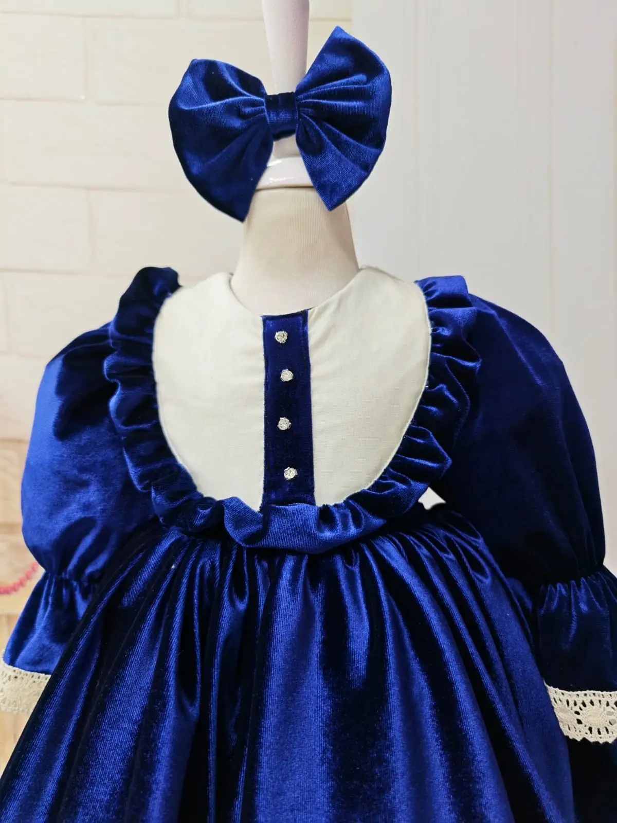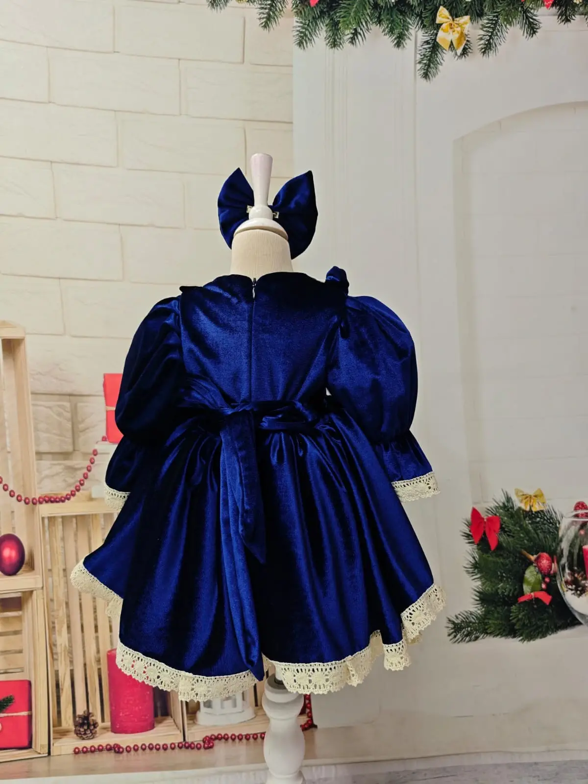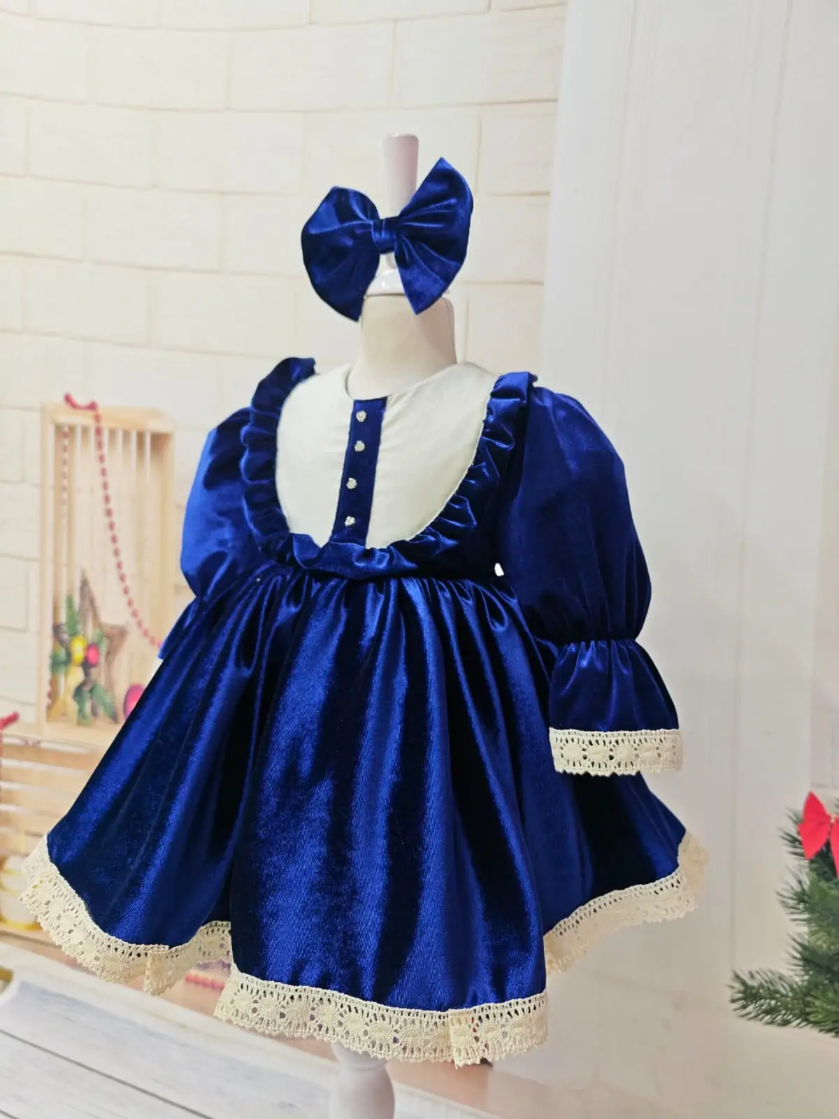 Küçük prensesler için özel olarak tasarlanmış lacivert kadife abiye elbise, zarafeti ve şıklığı bir arada sunar. Yumuşacık kadife kumaşı ile hem sıcak tutar hem de lüks bir görünüm kazandırır. Göğüs ve bel kısmındaki inci detayları elbiseye zarafet katarken, büyük fiyonk aksesuarı dikkat çekici bir şıklık sağlar. Özel günlerde, doğum günü partilerinde veya yılbaşı kutlamalarında küçük hanımların göz kamaştırmasını sağlar.