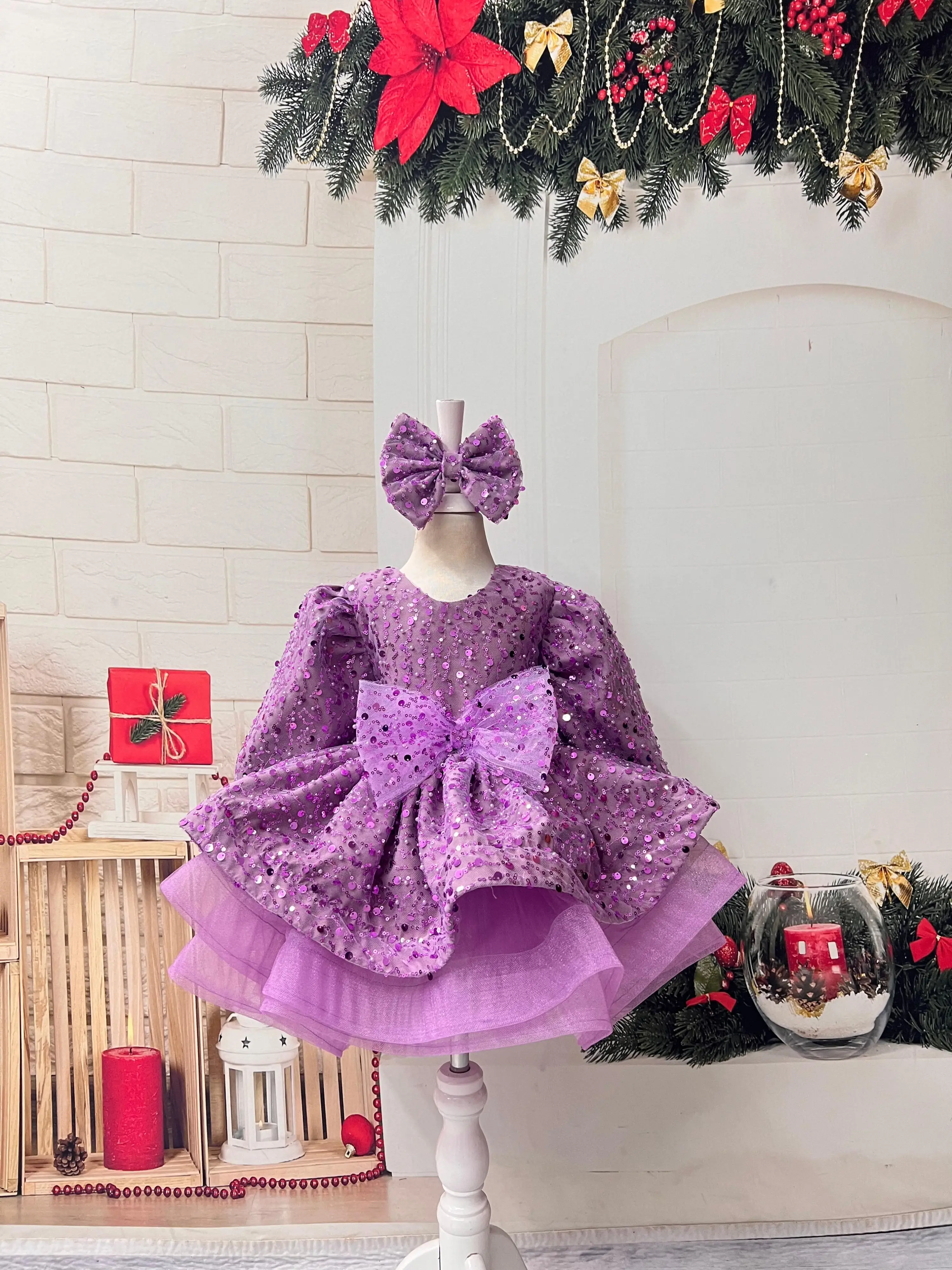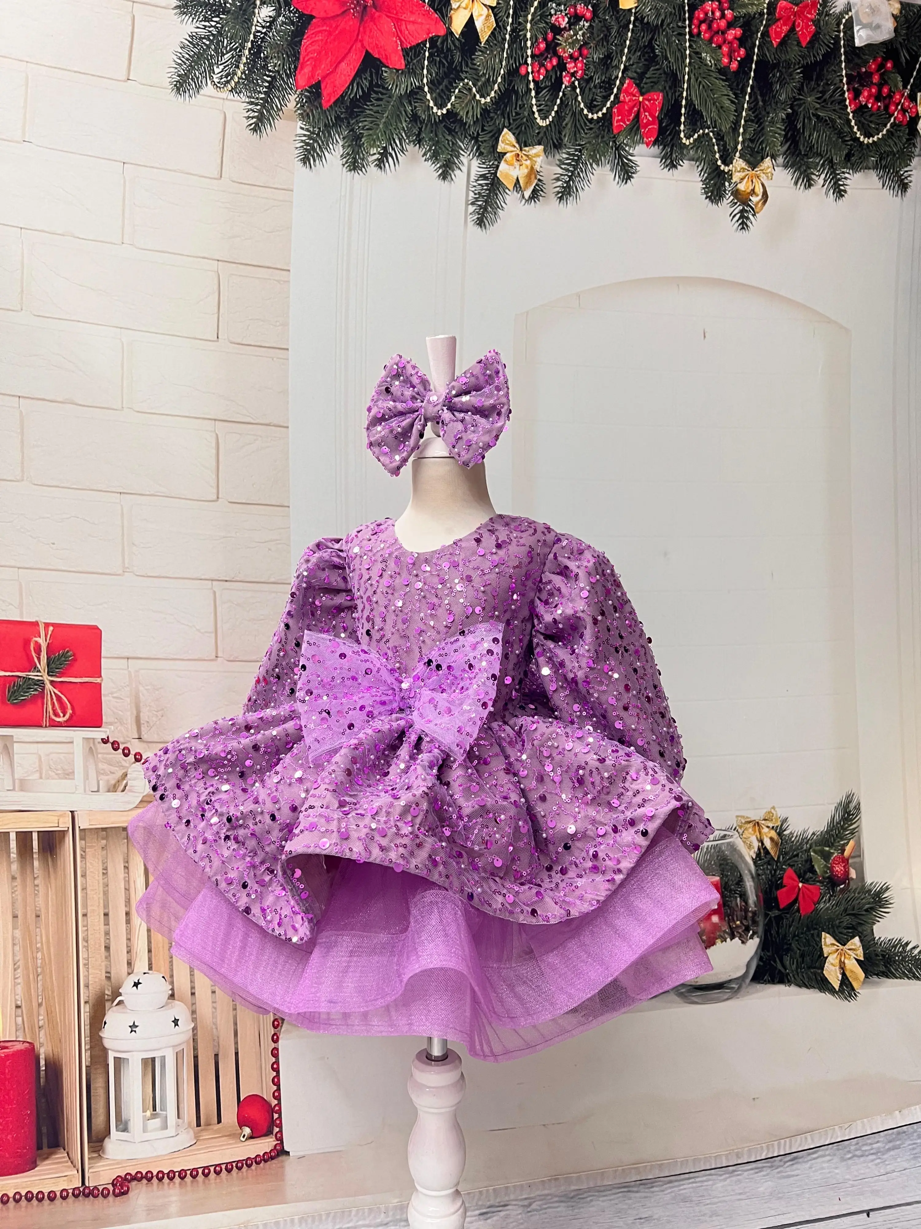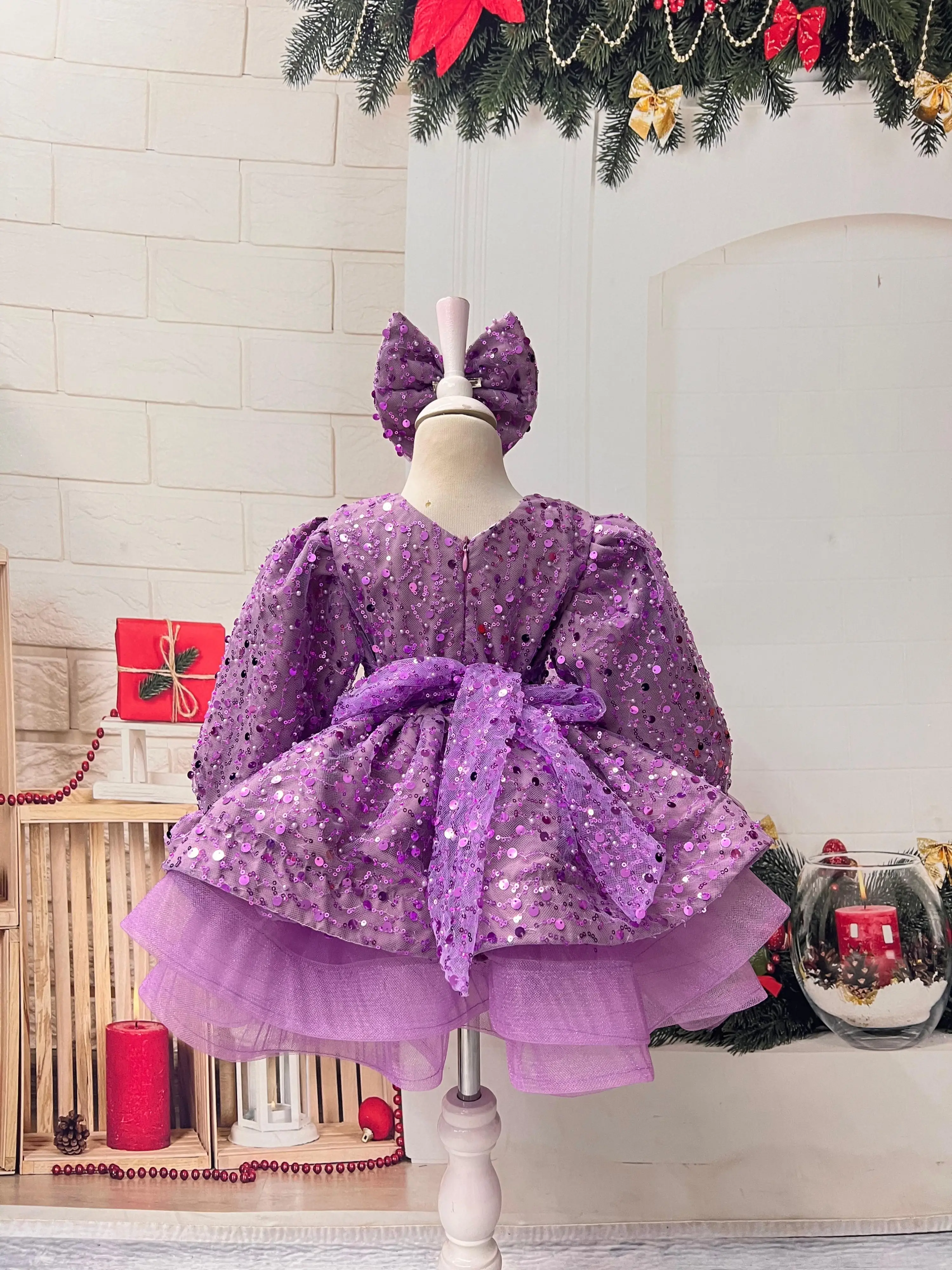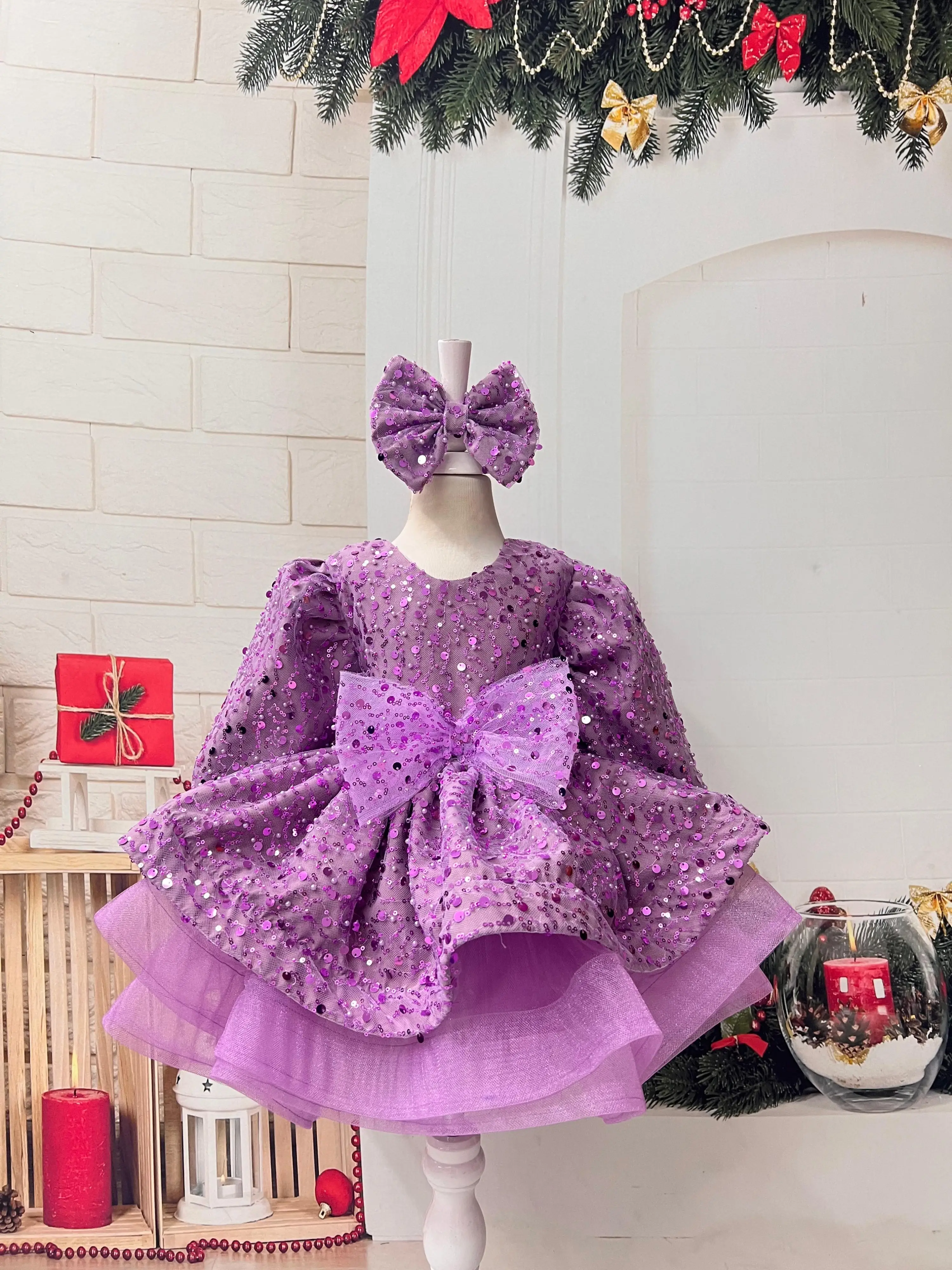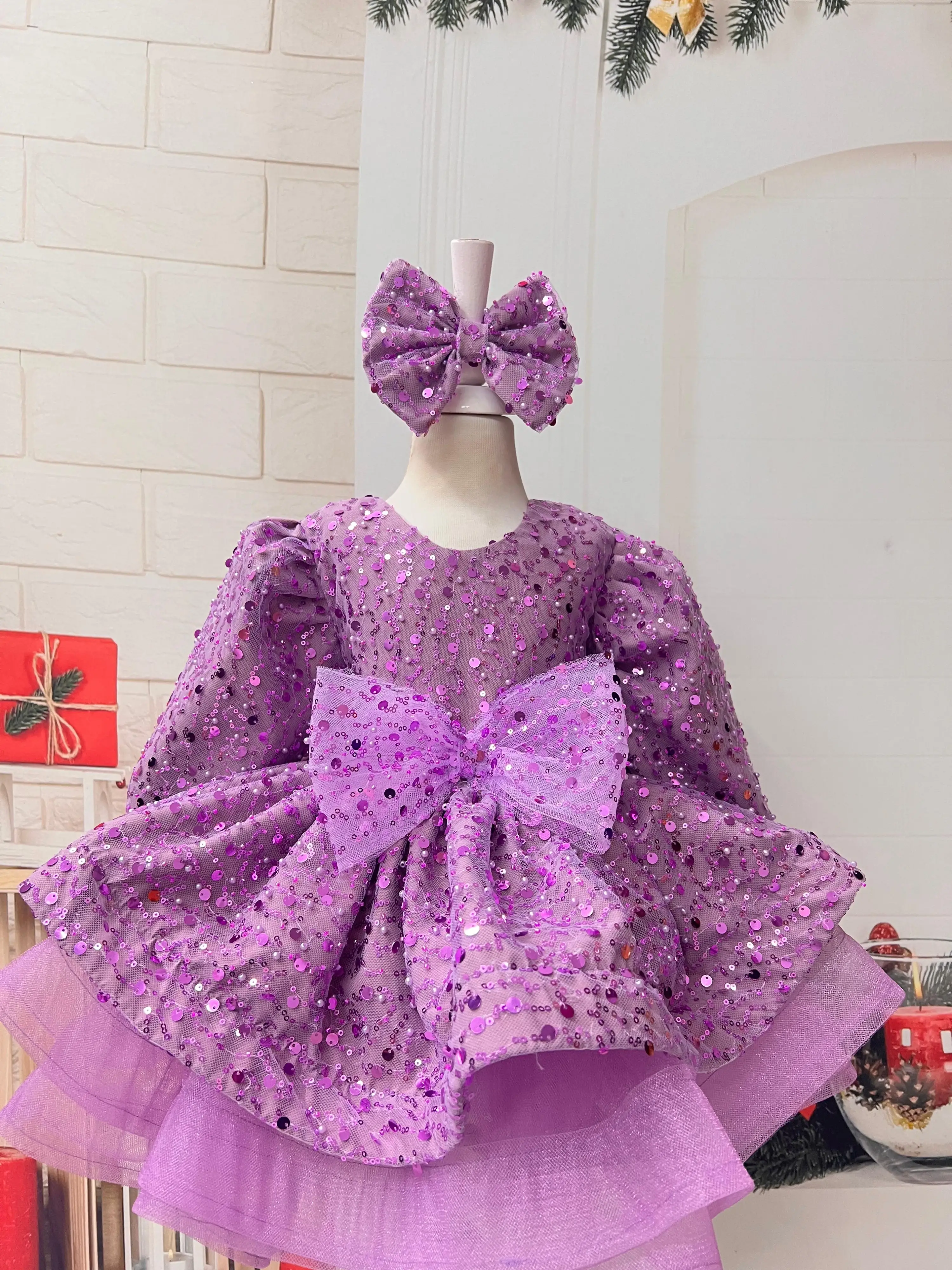 Nisa Kids imzası taşıyan bu lila renk kız çocuk abiye elbise, ışıltılı payet kumaşı ve zarif fiyonk detayıyla minik prensesler için özel olarak tasarlandı. Kat kat tül eteği sayesinde kabarık ve göz alıcı bir duruş sunar. Doğum günü, düğün, nişan, özel davetler ve fotoğraf çekimleri için ideal bir tercihtir. Şıklığı ve konforu bir arada sunan bu özel tasarım elbise, saç bandı ile kombin halinde gönderilmektedir.