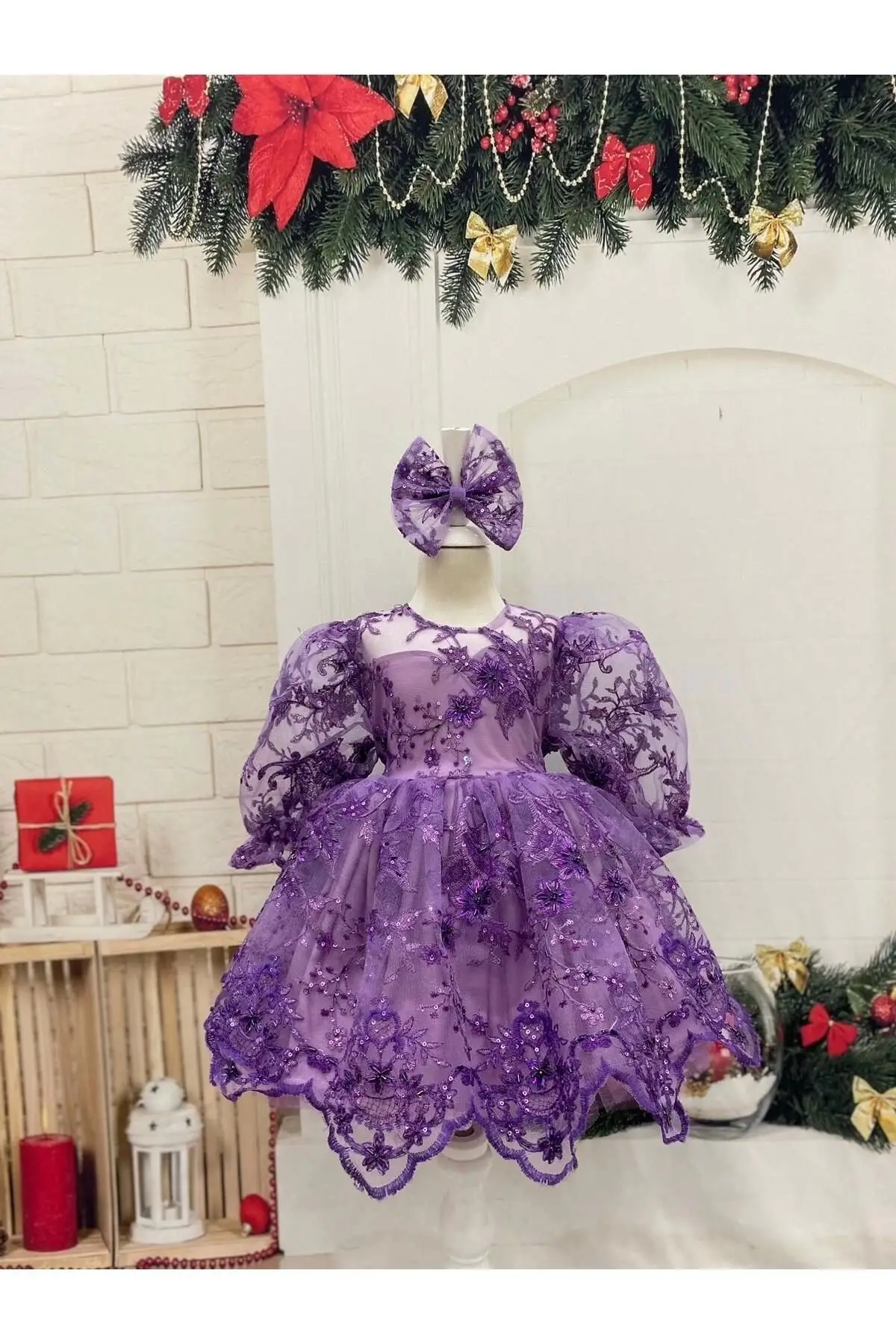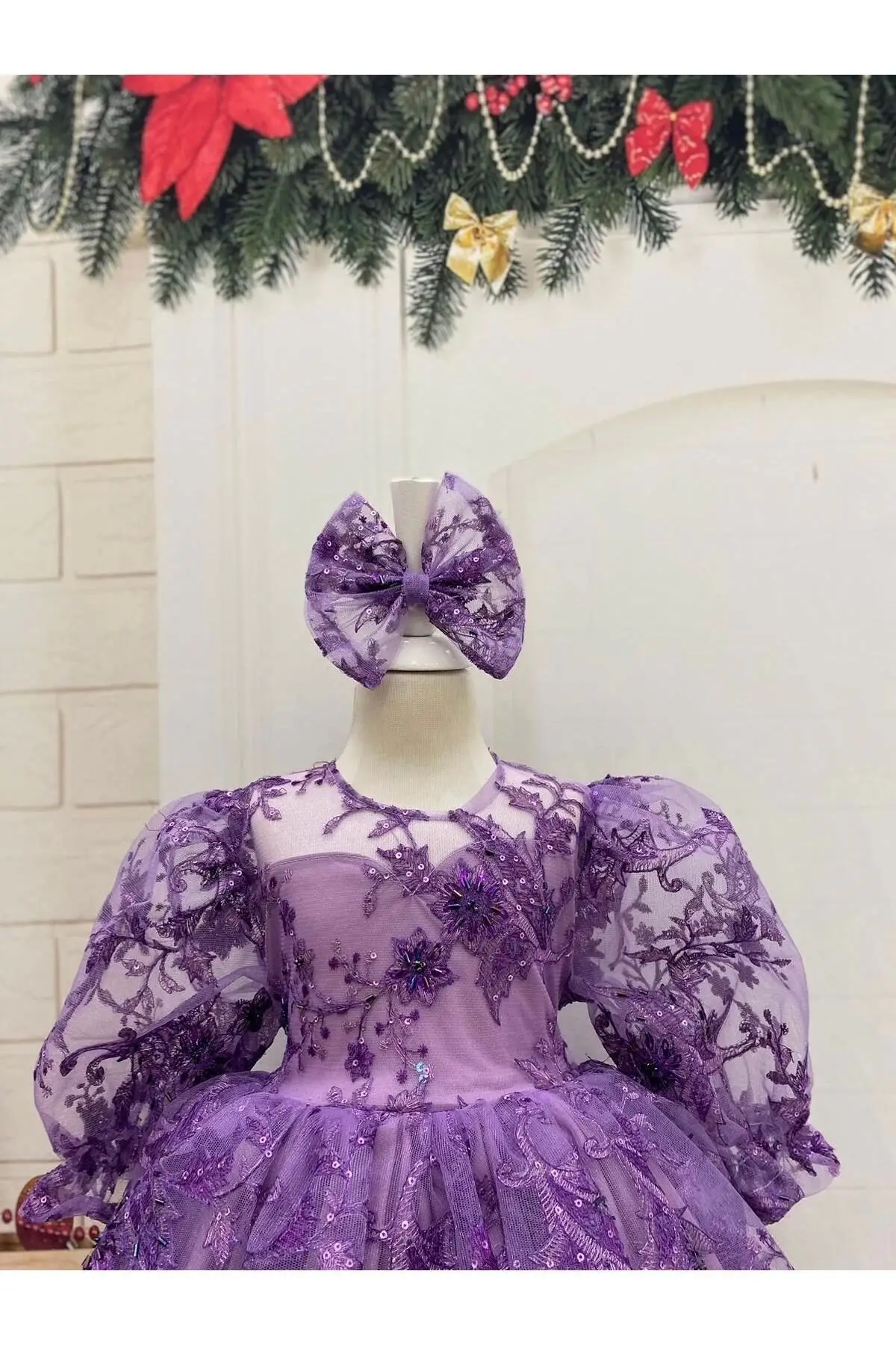 Lila Uzun Kollu Işıltılı Fiyonklu Kız Çocuk Abiye Elbise