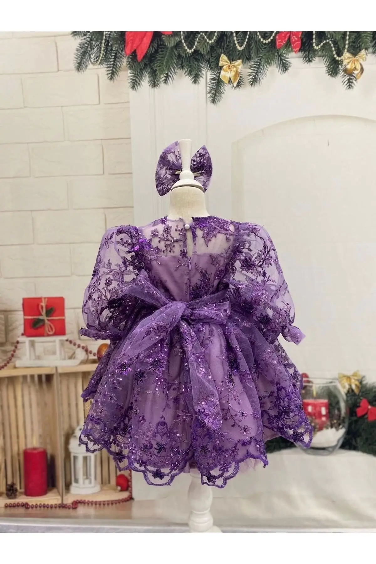 Mor Payetli Prenses Kız Çocuk Abiye Elbise – Balon Kollu & Fiyonk Aksesuarlı