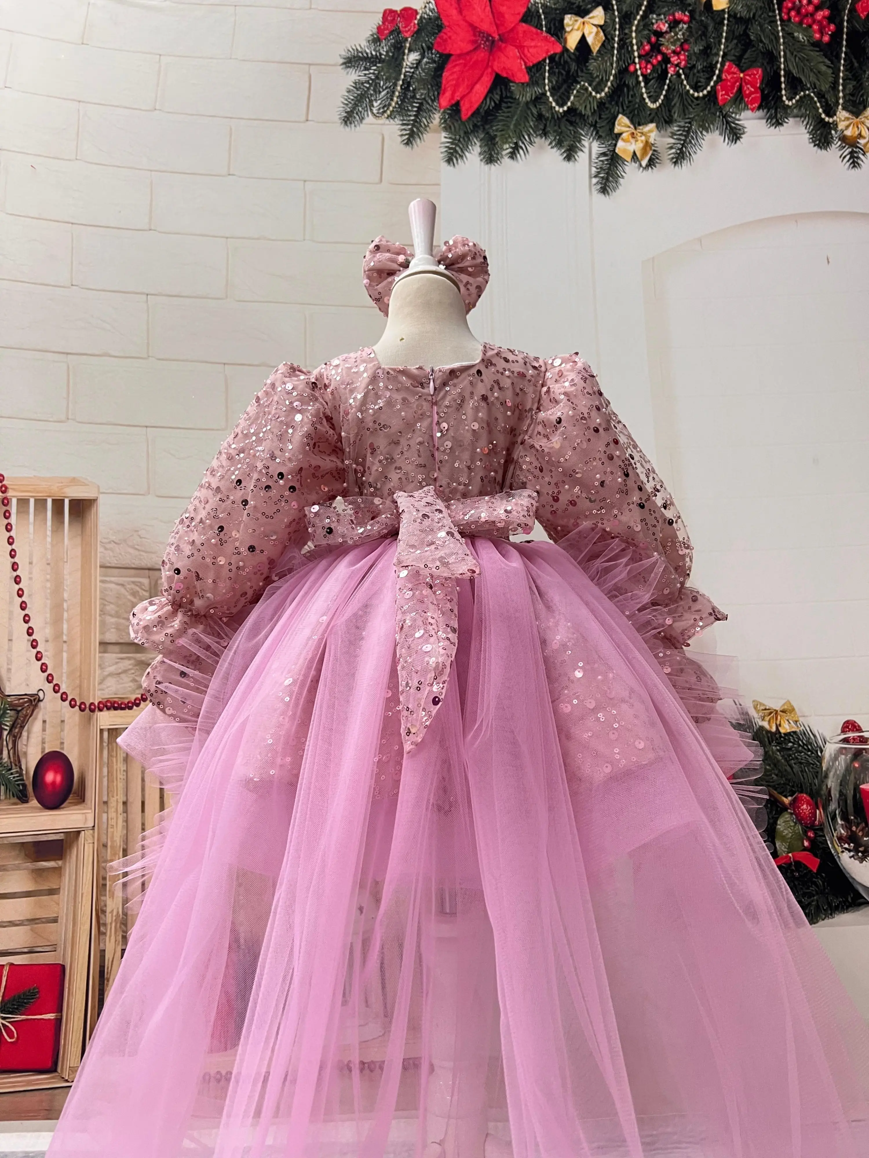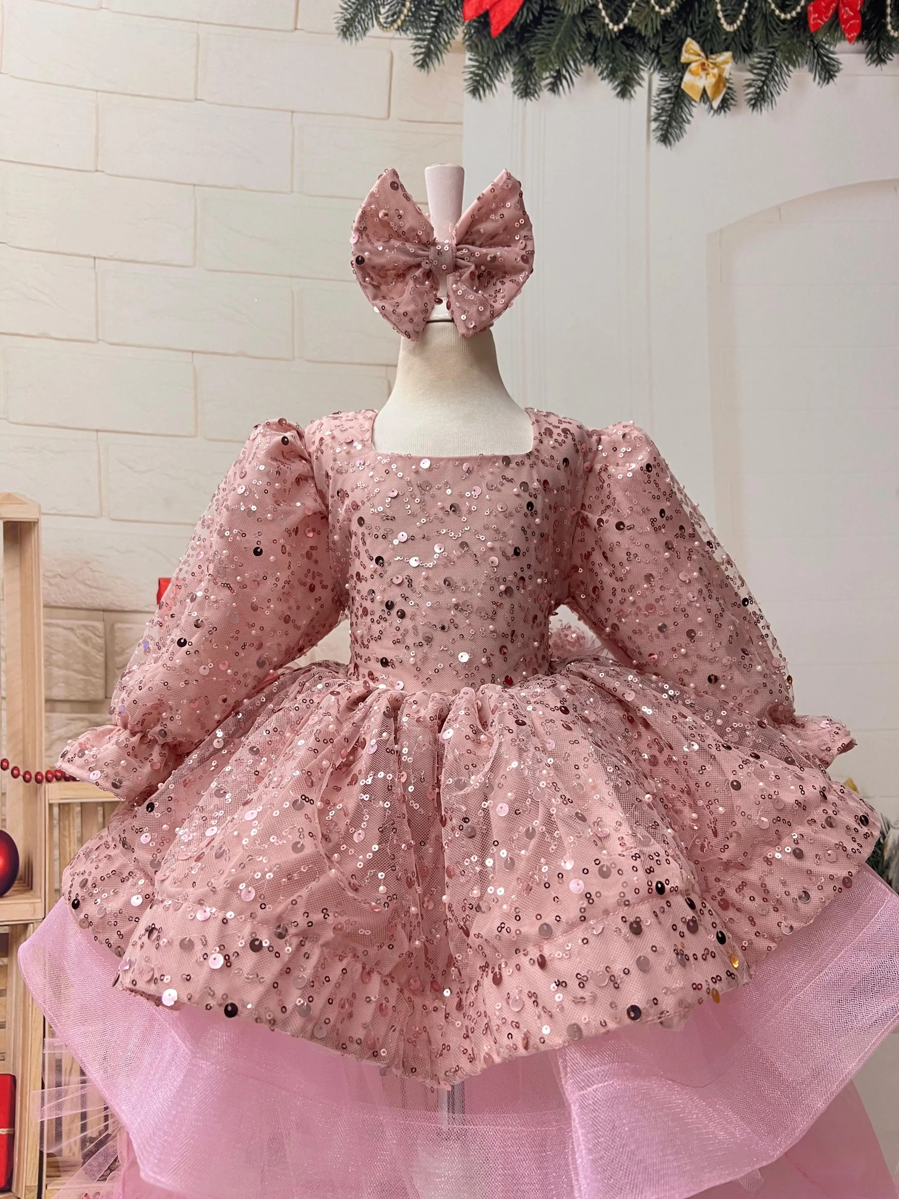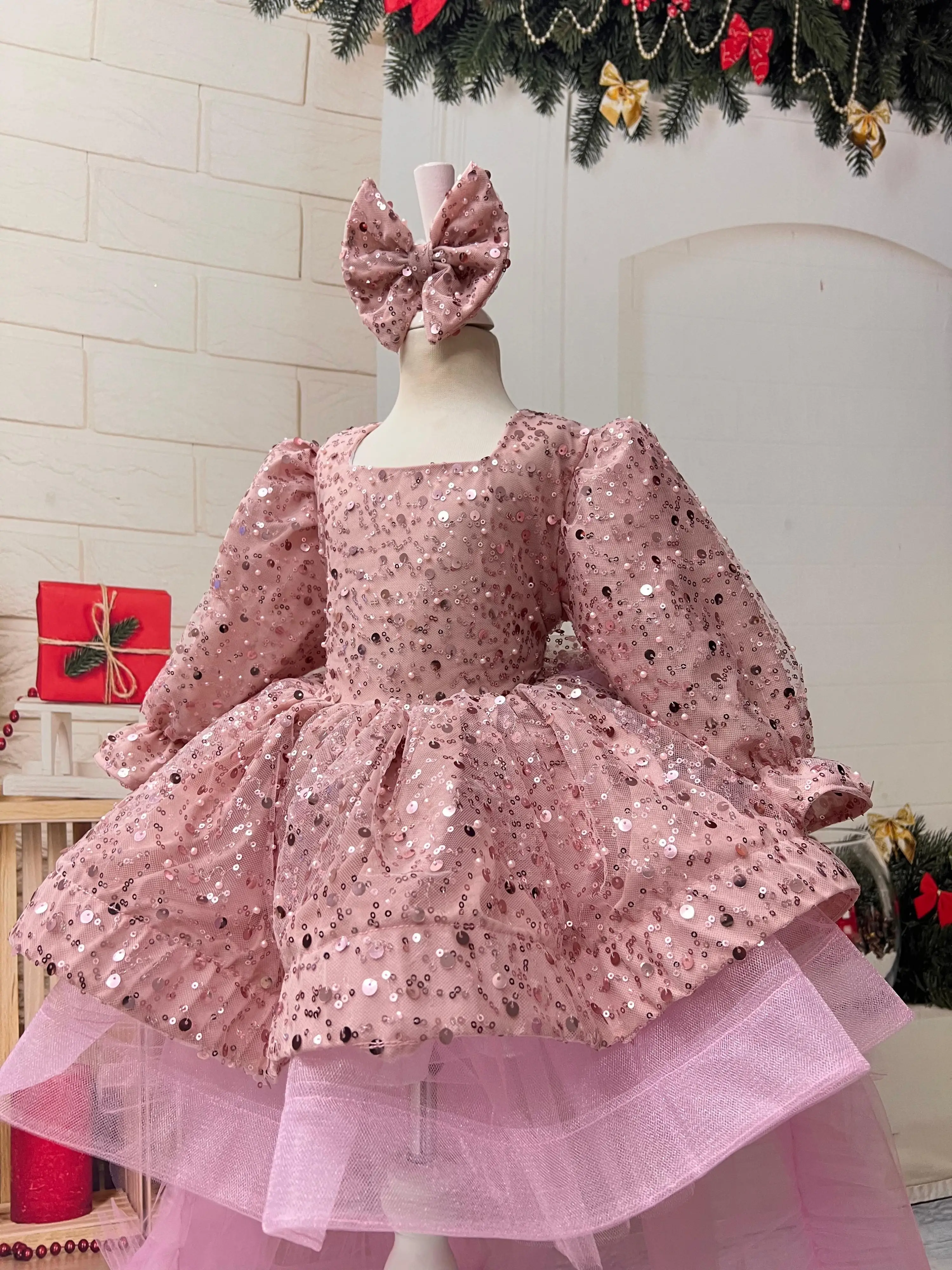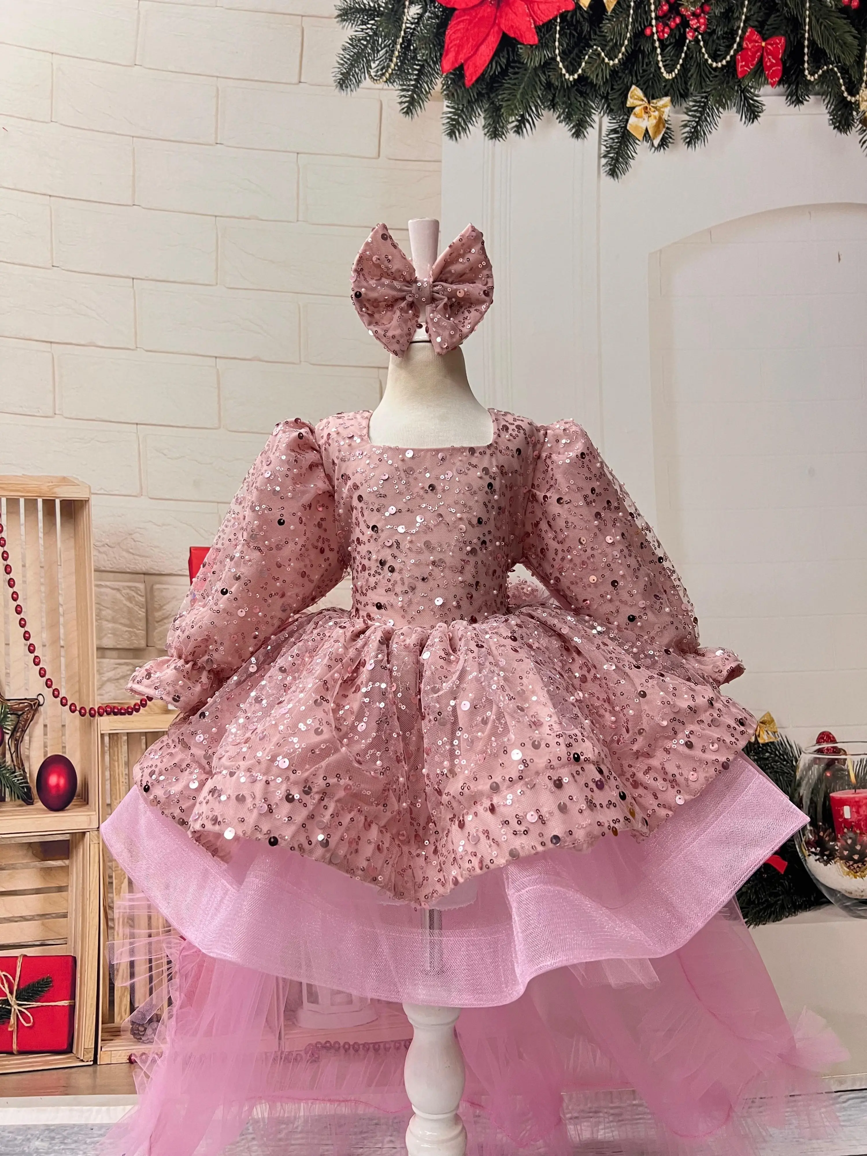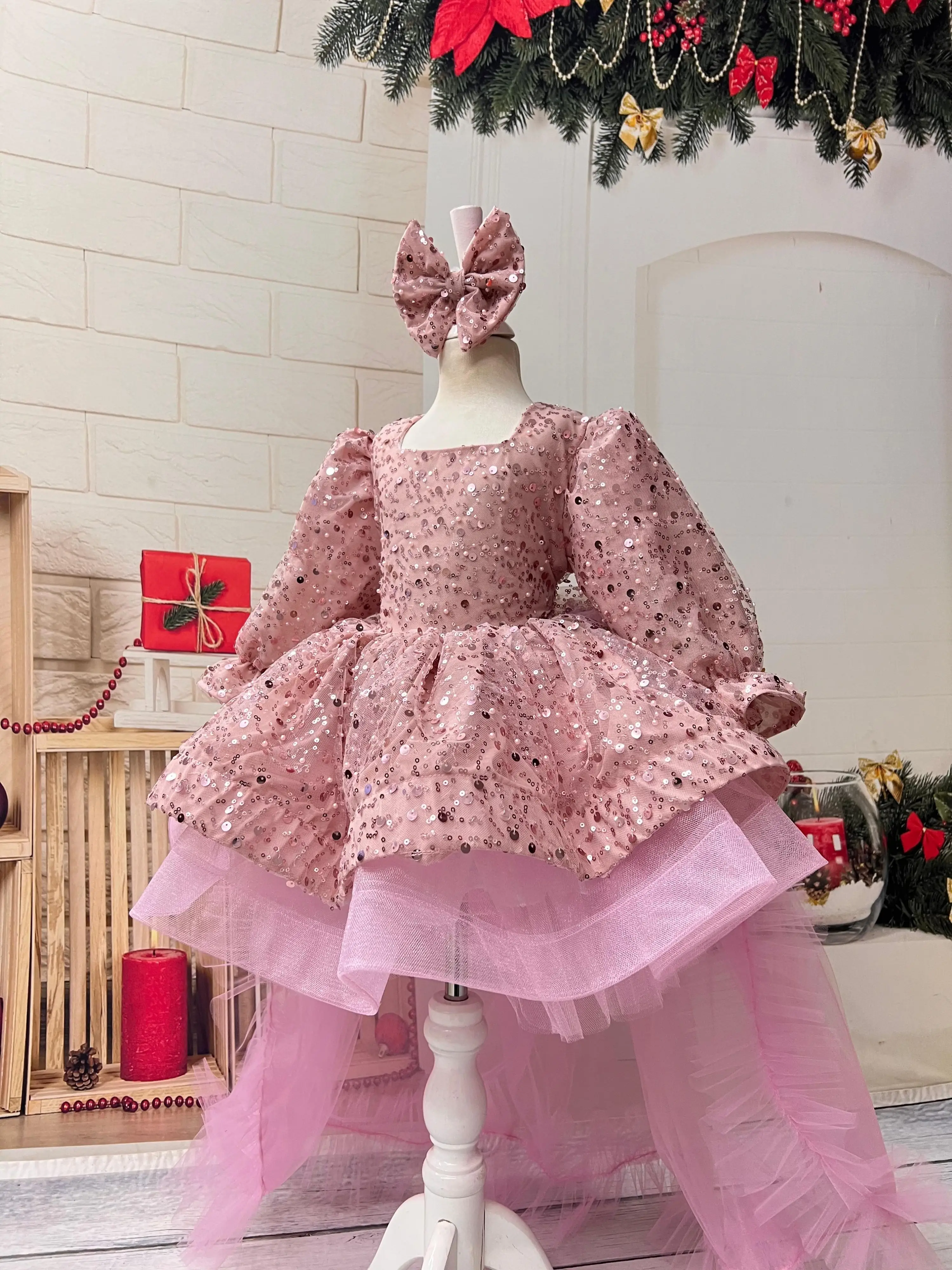 Küçük prensesinizin en özel günlerinde hayran bakışları üzerinde toplayacak, zarif ve gösterişli bir tasarımdır. Bu elbise, romantik pembe tonları ve parlak payet detaylarıyla göz kamaştırır. Doğum günü, mezuniyet, düğün gibi tüm davetler için mükemmel bir seçimdir.