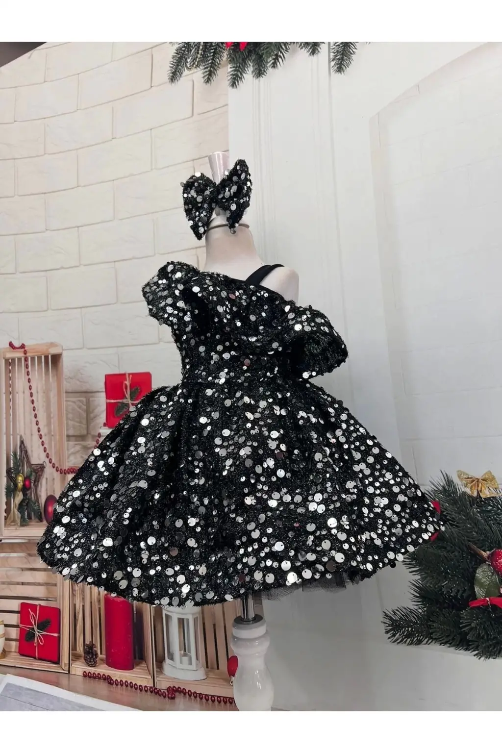 Siyah Payetli Tek Omuzlu Kız Çocuk Elbisesi astarlı özel günlerde çocuğunuzun kullana bileceği çok şık bir elbise doğun günleri nişan kına bayram özel günlerde giyine bilir